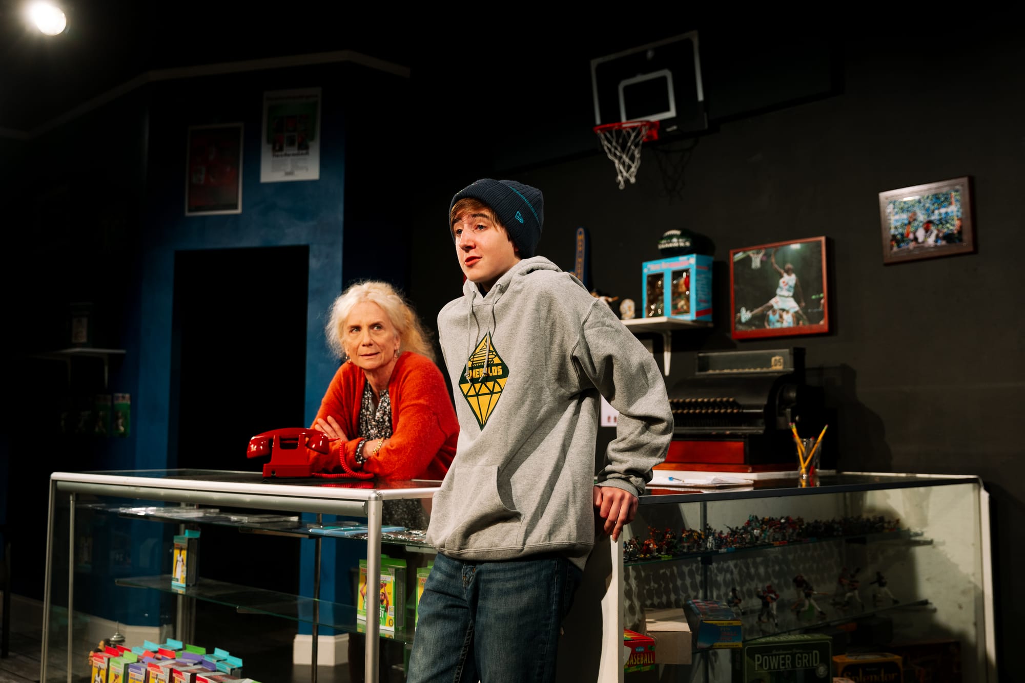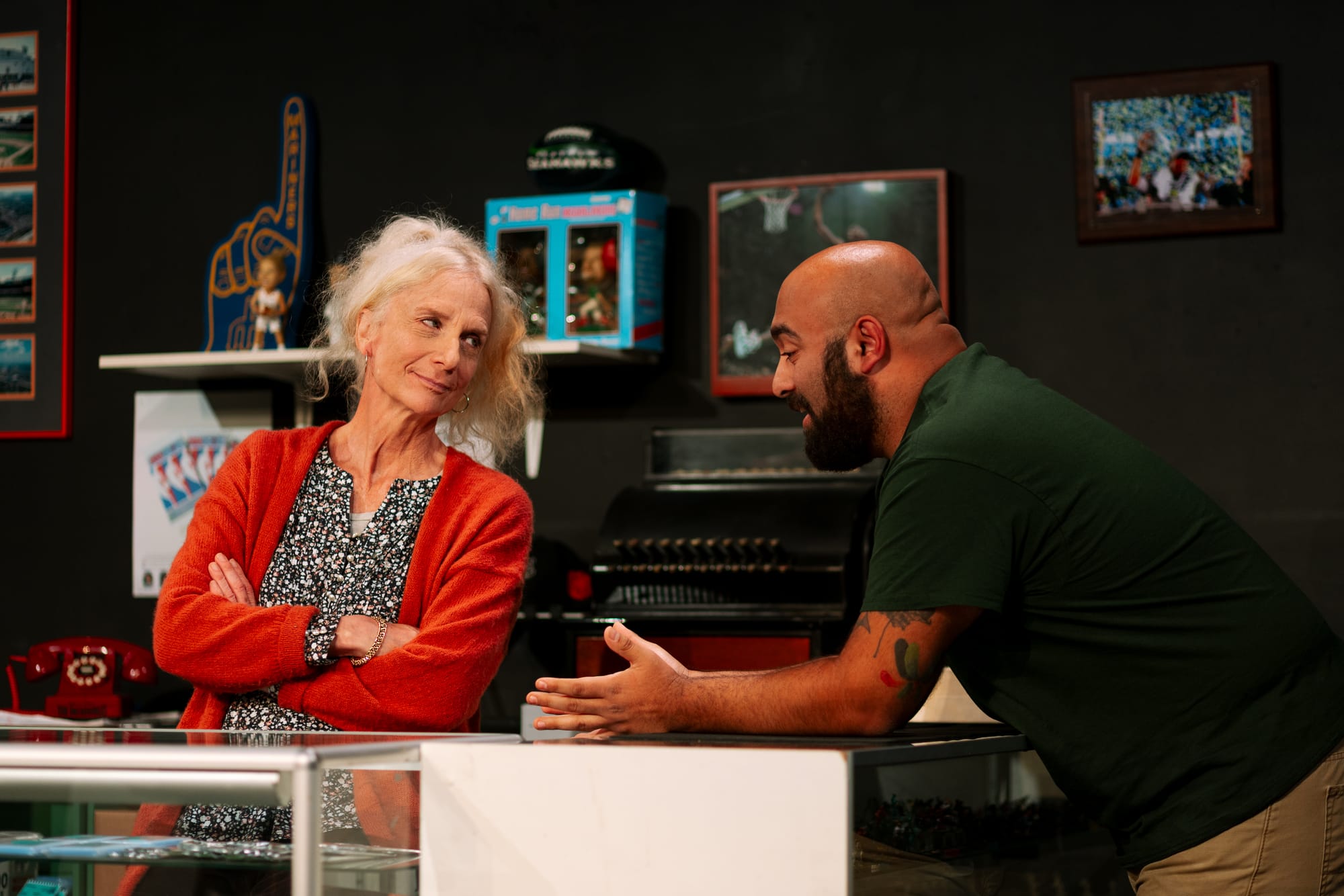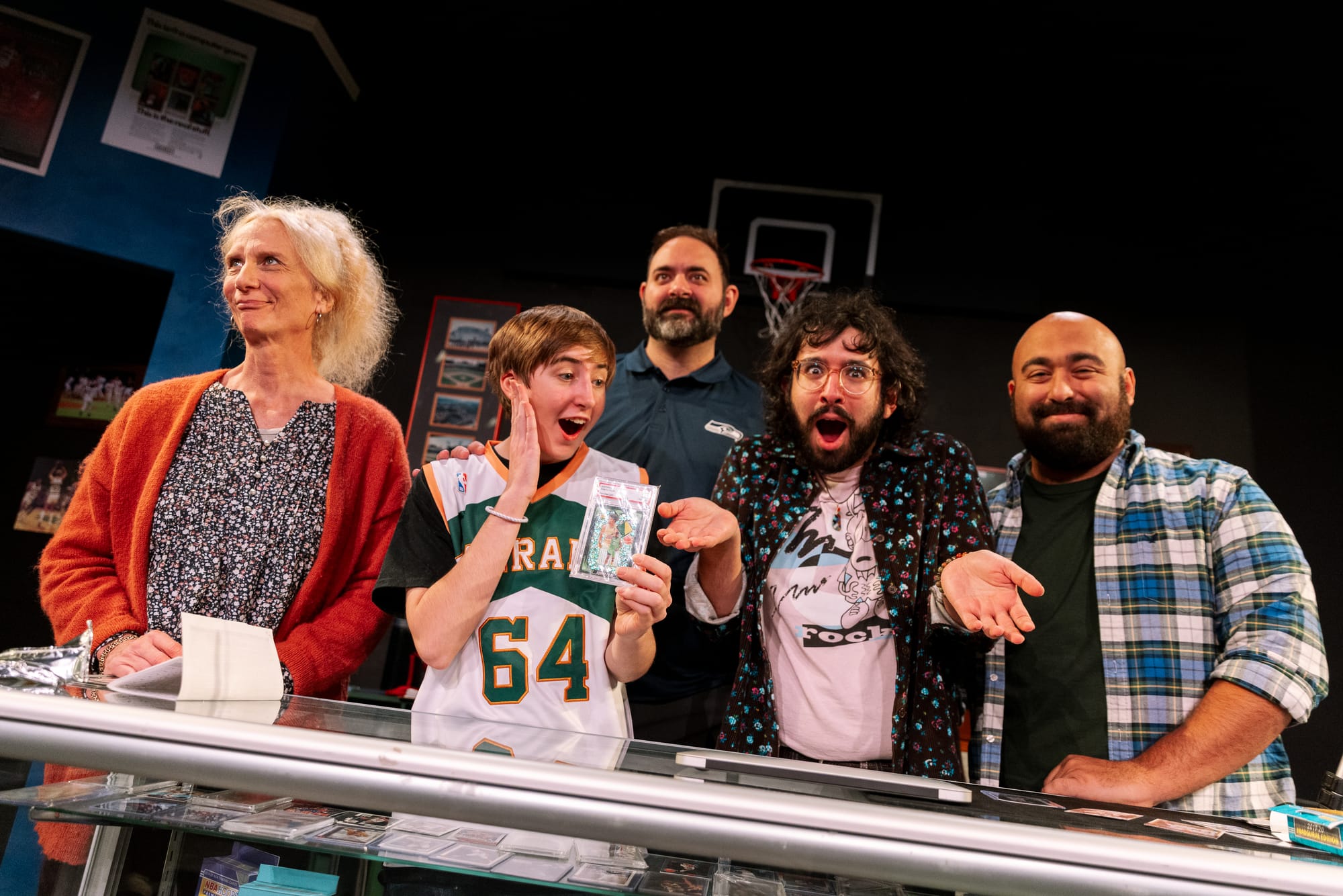 Barr's play takes place entirely - apart from a few brief asides - in the aforementioned Wax Harvest store, the audience literally walking through the store's entrance to get to their seats in director Jessica Love's intimate staging (Manuel Ortiz's scenic design provides a great lesson in using minimalism to exude maximalism). there's a gentle - if bordering on sluggish - workplace comedy vibe to the opening scenes here, introducing us to the Aunt Rhonda, her co-owner and nephew, Corbin (an endearing Rio Ragazzone), trading card-selling obsessive Marc (the towering but childish Josh Razavi), "non-sports" card collector Lex (the effortlessly charming Jo Tannous), and the young teen store regular, Griffey (Harper Levander).